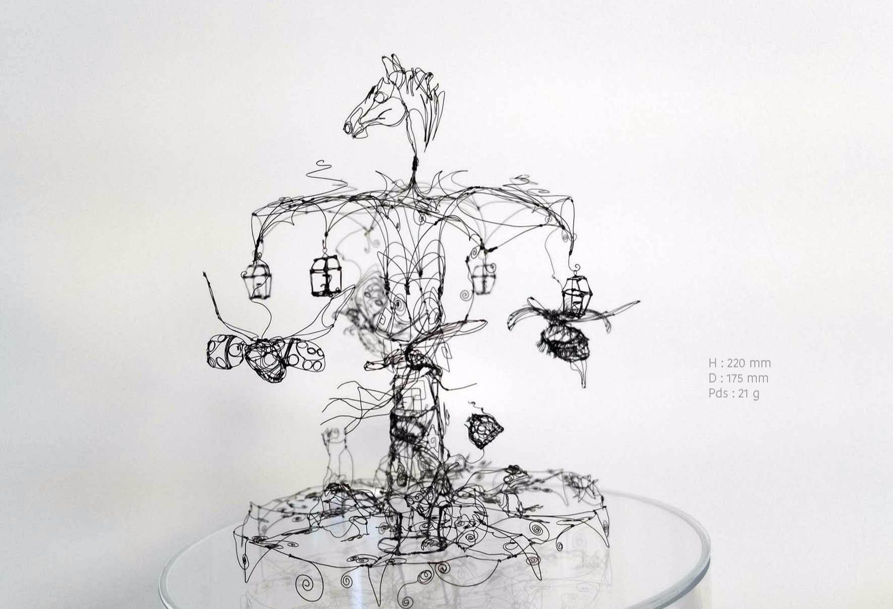 Vous allez découvrir mes créations réalisées en fil de fer ou en fil d'argent. La finesse et la souplesse de ces matériaux permettent de réaliser des objets solides, légers et aériens. Certaines de mes sculptures sont mobiles, elles s'animent grâce au courant d'air, au toucher ou à l'aide d'un petit moteur. J'expérimente les possibilités offertes par le concept du dessin dans l'espace inventé par Alexander Calder.